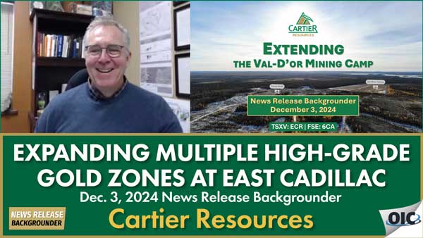 In this presentation, Cartier Resources CEO Philippe Cloutier reviews the December 3 news release announcing that Cartier had expanded the high-grade Gold Zones at East Cadillac. He reviews the exceptional drilling results from Cartier’s 100%-owned East Cadillac property near Val-d’Or, Québec, with highlights including 173.6 g/t Au over 0.5 m and 11.7 g/t Au over 4.0 m. The results affirm strong exploration potential and plans for a 100,000 Metre drill program.