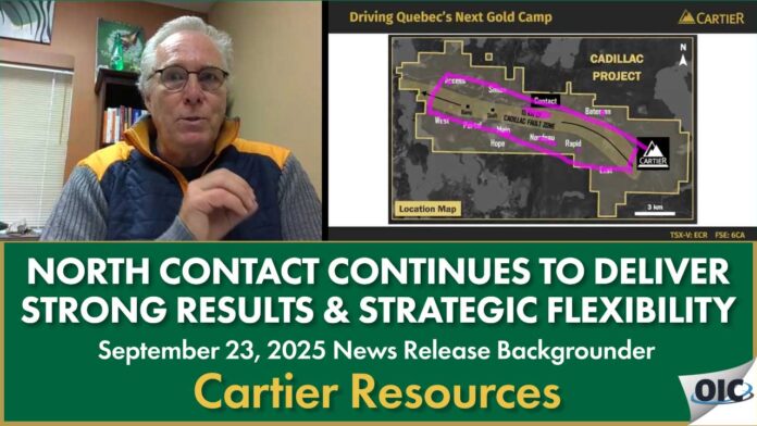 Val-d’Or, Quebec – September 23, 2025 – Cartier Resources (TSX-V: ECR) has released the first results from its fully funded 100,000-metre diamond drill program at the Cadillac Project in Val-d’Or, Quebec. The assays come from the Cartier Resources North Contact Zone within the Contact Sector and mark an encouraging start to the ambitious 600-hole campaign.